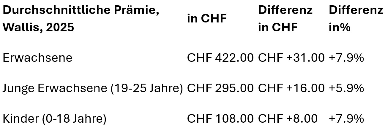 Die durchschnittliche Prämie für Erwachsene im Wallis wird 27 Franken unter dem Schweizer Durchschnitt liegen. In der Romandie wird das Wallis weiterhin die niedrigste Prämie haben. Der Bund hat für den Kanton Wallis zusätzliche 12,6 Millionen Franken für die individuelle Prämienverbilligung für das Jahr 2025 angekündigt. Der Grosse Rat wird im Dezember über die Gesamtsumme von 262,9 Millionen Franken entscheiden. Damit können Personen in bescheidenen wirtschaftlichen Verhältnissen bei der Bezahlung ihrer Prämien unterstützt werden.