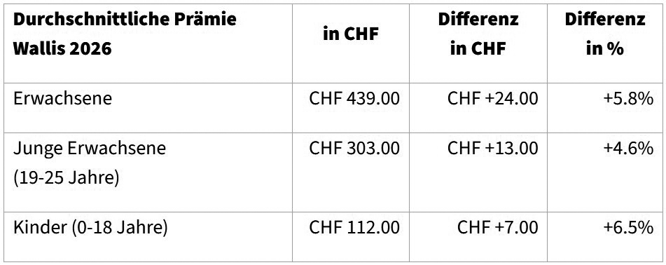 Das Bundesamt für Gesundheit (BAG) gab einen Anstieg von 17 Franken pro Monat der durchschnittlichen Schweizer Prämie (+4,4%) bekannt (alle Versicherungsmodelle, Franchisen und Alterskategorien zusammen). Im Wallis beträgt der Anstieg 21 Franken, was einem Anstieg von 5,9% entspricht. Sie ist für alle Altersklassen erheblich. Der Bund erklärt diesen Anstieg insbesondere damit, dass die Bevölkerung im Wallis älter ist als im Schweizer Durchschnitt: Der Anteil der über 65-Jährigen beträgt im Wallis 21% und im Schweizer Durchschnitt 19,5%.