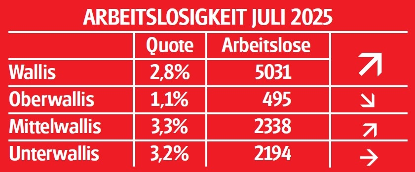 Ende Juli waren in den Regionalen Arbeitsvermittlungszentren (RAV) des Wallis 5031 Arbeitslose gemeldet. Im Vergleich zum Vormonat sind dies 72 mehr. Die Arbeitslosenquote stieg um 0,1 Prozentpunkte auf 2,8 Prozent.