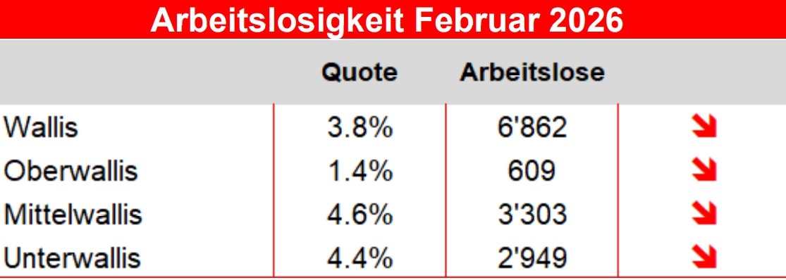 Ende Februar waren in den Regionalen Arbeitsvermittlungszentren (RAV) des Wallis 6'862 Arbeitslose gemeldet. Im Vergleich zum Vormonat sind dies 572 weniger. Die Arbeitslosenquote im Wallis sank um 0,3 Prozentpunkte auf 3,8%. Es ist dies der stärkste Rückgang unter allen Schweizer Kantonen.